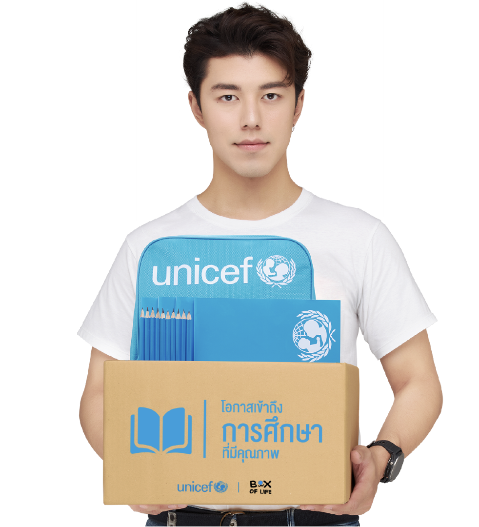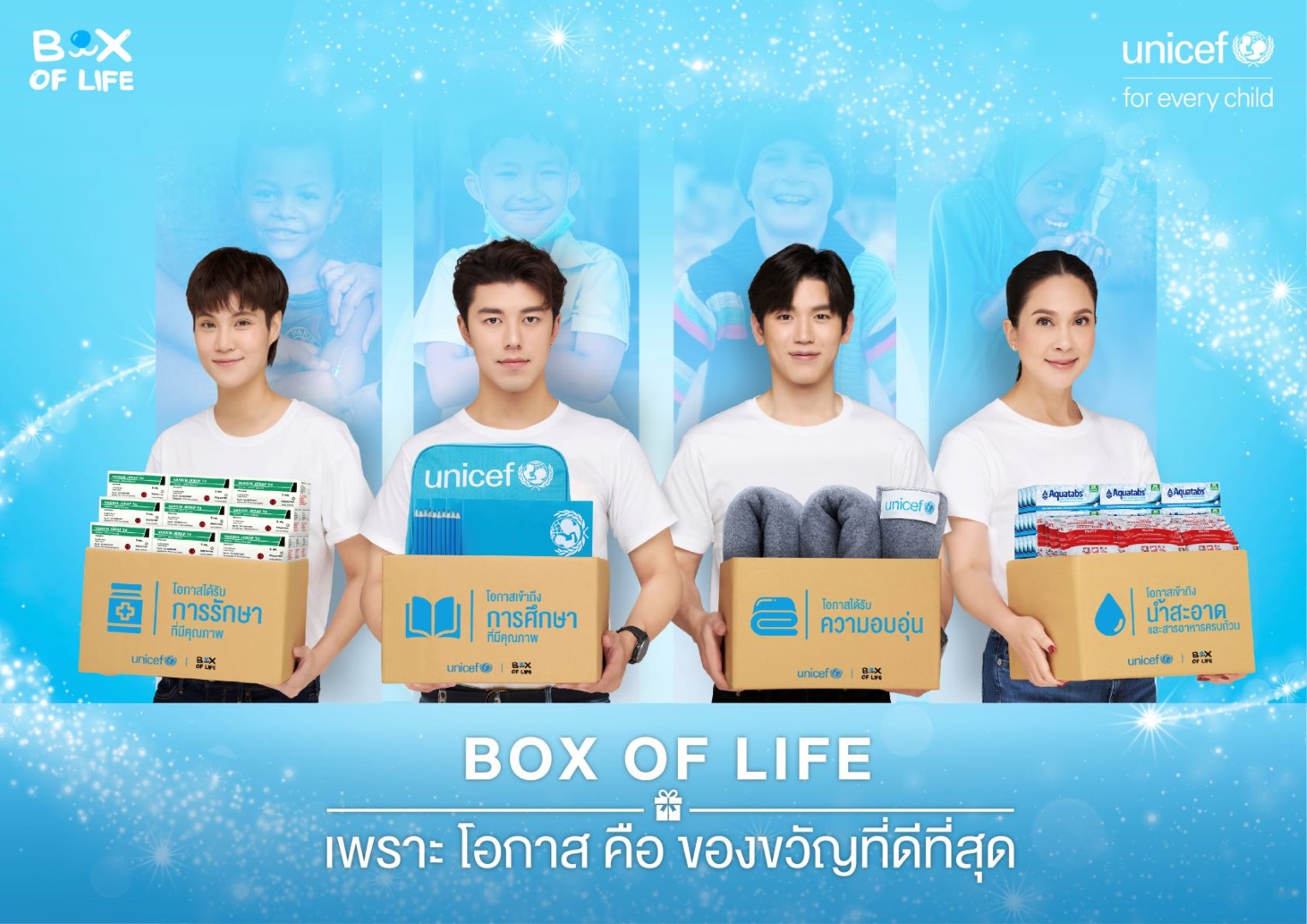 องค์การยูนิเซฟ ประเทศไทย ร่วมกับเหล่าศิลปินและนักแสดงชื่อดัง นาย – ณภัทร เสียงสมบุญ, แหม่ม - คัทลียา แมคอินทอช, หมอเจี๊ยบ - ลลนา ก้องธรนินทร์ และ นิว - ฐิติภูมิ เตชะอภัยคุณ ชวนคนไทยทำความดีส่งท้ายปีเก่าต้อนรับปีใหม่ เพราะในช่วงเวลาแห่งความสุข ยังมีเด็ก ๆ อีกหลายล้านคนต่างก็รอของขวัญที่สำคัญเช่นกัน และ “ของขวัญ” ที่ดีที่สุดก็คือ “โอกาส” ยูนิเซฟขอเชิญชวนทุกท่านร่วมมอบโอกาสให้เด็ก ๆ ที่ขาดแคลน ได้เข้าถึงน้ำดื่มที่สะอาด อาหารที่มีโภชนาการครบถ้วน การดูแลสุขภาพอย่างมีคุณภาพ ได้รับความอบอุ่นท่ามกลางภัยหนาว และได้เข้าถึงการศึกษาที่มีคุณภาพ ด้วยการบริจาคในแคมเปญ Box of Life ผ่านทาง https://www.unicef.or.th/boxoflife หรือค้นหาคำว่า UNICEF BOX OF LIFE เพื่อส่งมอบความช่วยเหลือไปถึงเด็ก ๆ ที่กำลังเผชิญกับความยากลำบากทั้งในประเทศไทยและทั่วโลก