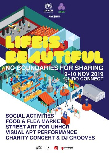 ครั้งแรกในประเทศไทย UNHCR ร่วมมือกับ บริษัท ไลฟ์อีส กรุ๊ป จำกัด กลุ่มธุรกิจเพื่อสังคมที่มีจุดมุ่งหมายในการสร้างสรรค์สังคมแห่งการเกื้อกูล จัดงานไลฟ์สไตล์ LIFEiS BEAUTiFUL - No boundaries for sharing สร้างปรากฎการณ์การรวมตัวกันของกลุ่มคนหลากหลายความสนใจ สร้างพื้นที่แห่งการสร้างสรรค์และส่งเสริมการแบ่งปันและการให้แก่คนรุ่นใหม่ พร้อมระดมทุนช่วยเหลือวิกฤตผู้ลี้ภัยโลกในปัจจุบัน