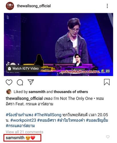 ปรากฎการณ์ที่ต้องร้อง โอ้มายก๊อด!! เมื่อซูเปอร์สตาร์ระดับโลก “Sam Smith” เห็นคลิปของศิลปินหนุ่มทอม-อิศรา กิจนิตย์ชีว์ และนักร้องลูกทุ่งสาวสุดเซ็กซี่กระแต อาร์สยาม ร่วมกันโชว์พลังเสียงร้องเพลง “I’m Not The Only One” เจ้าตัวถึงกับเกิดอาการเป็นปลื้มสุดๆ จนต้องเข้ามากดหัวใจ และคอมเม้นท์รัวๆ ผ่าน Instagram และ Twitter